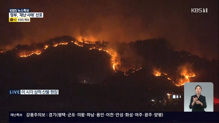 당국은 오후 1시50분 전국 소방동원령 1호를 발령한데 이어 오후 2시 10분에 산불재난 국가위기경보 ‘심각’을 발령했다.