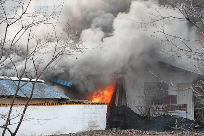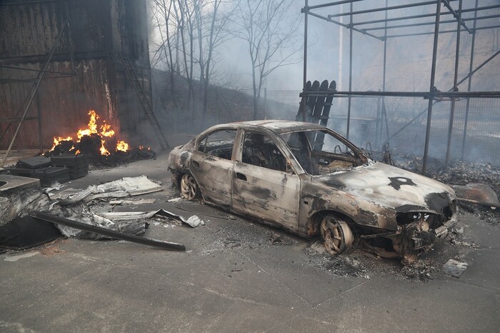 ▲ 4일 오후 경북 울진 북면 한 공장에 세워진 차들이 불에 타 뼈대만 남았다. [울진=연합뉴스] |