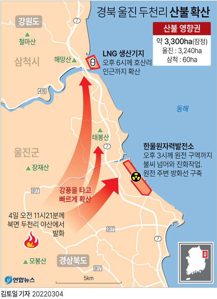 ▲ 울진·삼척 산불 확산 현황. [그래픽=연합뉴스] |