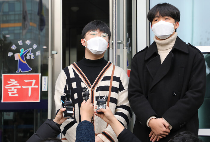 ▲ 15일 서울행정법원 앞에서 2022학년도 수능 생명과학Ⅱ 20번 문항 정답 취소 행정소송을 제기한 응시자들이 취재진의 질문에 답하고 있다. [서울=연합뉴스] |