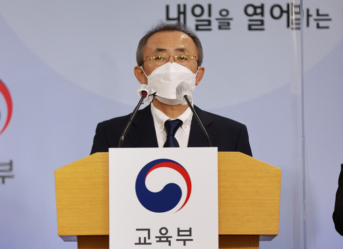 ▲ 강태중 한국교육과정평가원장이 15일 오후 정부세종청사에서 2022학년도 대학수학능력시험(수능) 과학탐구영역 생명과학Ⅱ 정답 결정 취소 소송 선고 결과와 관련해 입장문을 발표하고 있다. 강 원장은 사태에 책임을 지고 사퇴하겠다고 밝혔다. [세종=연합뉴스] |
