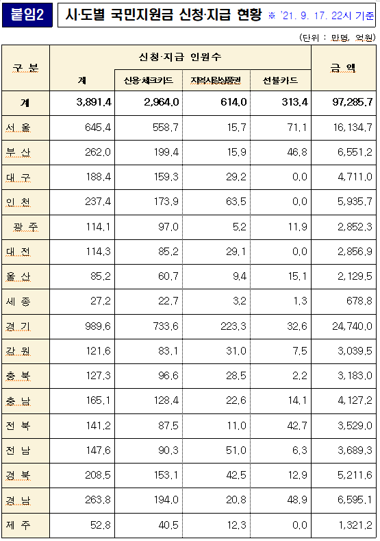 시도별로 신청·지급 현황을 보면, 서울은 3891만4천 명 중 645만4천 명에 1조6134억7천만 원을 지급했고, 부산 262만 명( 6551억2천만 원), 인천 237만4천 명(5935억7천만 원) 대구 188만4천 명(4711만 원) 등이었다.