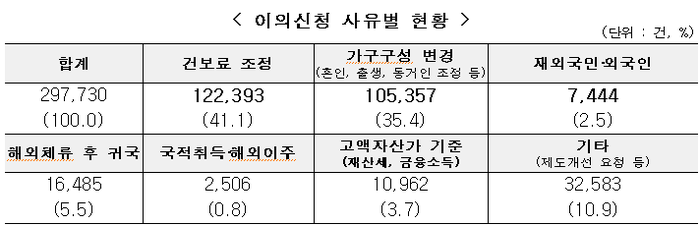 이의신청사유 '건보료 조정'(41.1%)·'가구구성 변경'(35.4%) 순