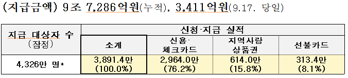 3981만4천 명 중 76.2%(2964만 명)는 신용·체크카드로, 15.8%(614만 명)는 지역사랑상품권으로, 8.1%(313만4천 명)는 선불카드로 각각 수령했다. 17일 하루엔 136만4천명이 3411억원을 받아갔다.