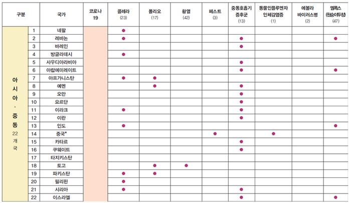 황열은 42개국, 콜레라는 23개국, 폴리오는 17개국이 지정됐고, 중동호흡기증후군(MERS·메르스)은 사우디아라비아, 아랍에미리트, 예멘, 요르단, 이라크, 이란, 카타르, 쿠웨이트, 이스라엘 등 13개국이 검역관리지역이 됐다.
