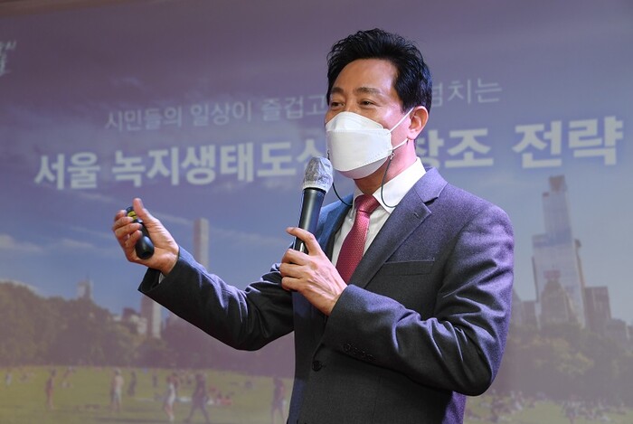 ▲ 오세훈 서울시장이 21일 서울 종로구 세운상가 세운홀에서 '녹지생태도심 재창조 전략'을 발표하고 있다. [서울시 제공] |