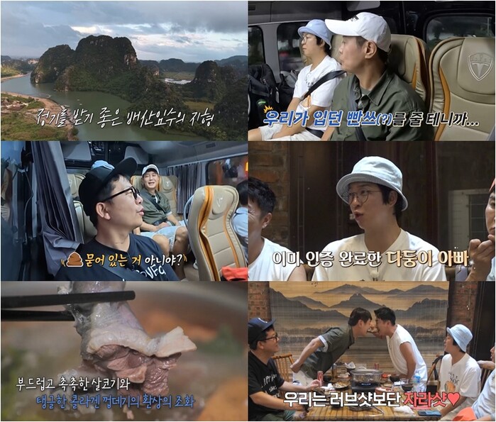 앞서 닌빈의 명소 ‘짱안’에서 전통 배 투어를 마친 ‘독박즈’는 이날 장동민이 예약한 2일 차 숙소로 향한다. 이동하는 차 안에서 장동민은 “오늘 가는 숙소는 프리미엄 호텔!”이라고 호기롭게 외치고, 홍인규는 “이름에 ‘프리미엄’이 붙은 걸 보니 좋은 곳 같네”라며 기대한다. 장동민은 “맞다. ‘새신랑’ 준호 형의 정기를 확실히 충전해줄 수 있는 곳!”이라고 강조한다. 이어 그는 “예로부터 ‘배산임수’ 지형에 가면 정기를 많이 받을 수 있다고 하는데, 이곳이 그렇다”고 설명한다. 2세를 계획하고 있는 김준호는 ‘급’ 화색이 돌고, ‘정기’ 얘기가 나오자 ‘다둥이 아빠’ 김대희도 “나랑 인규의 정기도 받아 가. 우리가 입던 속옷 줄게~”라며 장난을 친다. 김준호는 “애국자들의 정기? 혹시 X 묻어있는 거 아냐?”라고 의심해 모두를 폭소케 한다.