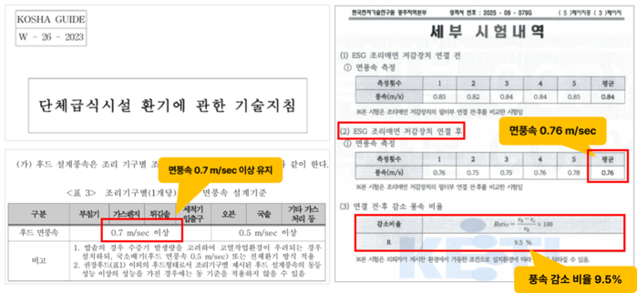 한국전자기술연구원 시험 결과에 따르면, 에어데이터랩의 솔루션은 급식실 환경에서 가장 중요한 지표인 '후드 면풍속'의 안정적인 확보와 유지에서 탁월한 성과를 보였다. 면풍속은 조리 시 발생하는 유해 물질을 후드가 얼마나 강력하고 균일하게 빨아들이는지를 결정하는 핵심 척도다.