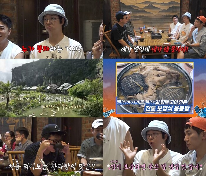 이날 닌빈 보양식 맛집에 들어선 장동민은 “남자들의 정기에 가장 좋다는 염소 고기와 ‘용봉탕’(자라탕)을 먹을 거다. 저지방에 고단백 식품으로 2세를 계획 중인 준호 형에게 안성맞춤이다”라고 설명한다. 하지만 김준호는 “어제 사원에서 ‘자라신’한테 소원을 빌었는데 (자라를) 먹어도 돼?”라며 머뭇거리고, 유세윤도 “자라신이 격노하실 듯~”이라고 호응한다. 그러자 홍인규는 “아니다. 2세를 위한 기도였으니 특별히 이해해 주실 거다”면서 김준호를 설득해 모두를 폭소케 한다.