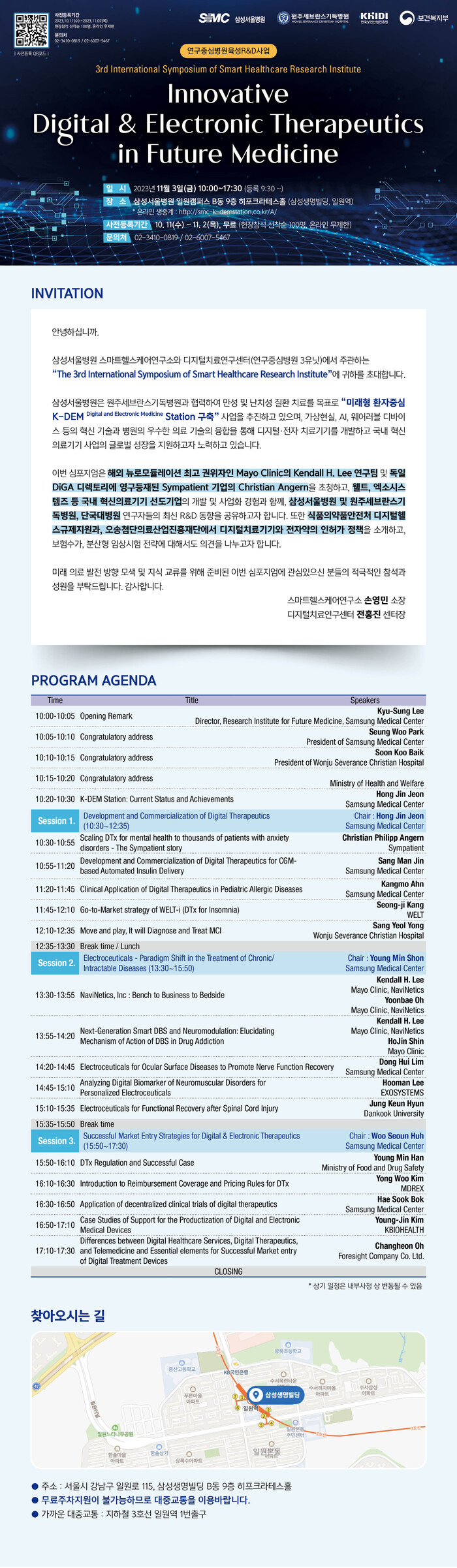 이규성 미래의학연구원장(연구부원장)은 “삼성서울병원은 디지털 및 전자 기술과 의료와의 지속적인 협력을 강화하고, 개발 기술이 의료 현장에서 빠르게 적용될 수 있도록 원내 역량을 적극 지원해 나가겠다”며 “이번 심포지엄을 통해 국내외 디지털·전자 치료기기 분야 전문가들이 모여 활발한 지식 교류 및 소통의 시간을 가지는 기회가 되길 바란다”고 전했다.