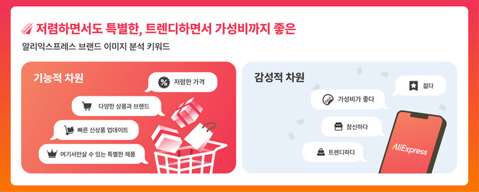 소비자들은 알리익스프레스를 떠올릴 때 ‘저렴한 가격’, ‘다양한 상품과 브랜드’, ‘빠른 신상품 업데이트’, ‘여기서만 살 수 있는 특별한 제품’을 주요 강점으로 꼽았다. 감성적 측면에서는 ‘가성비’, ‘젊음’, ‘참신함’, ‘트렌디함’ 등 긍정 키워드가 도출돼 실용성과 감성을 동시에 만족시키는 브랜드로 인식되고 있음을 보여줬다.