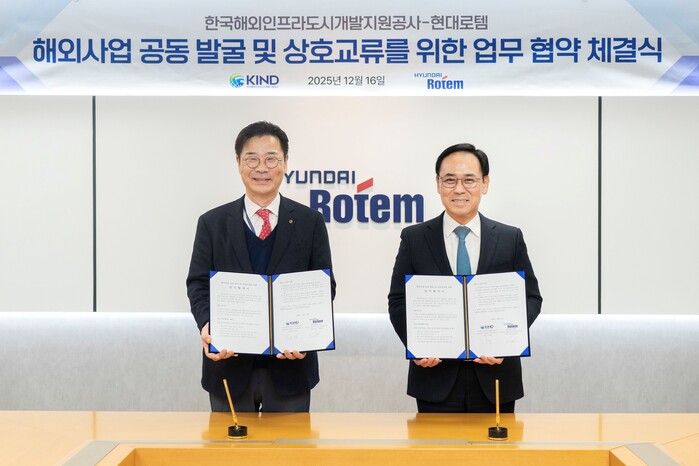 현대로템은 지난 16일 경기도 의왕시에 있는 본사 사옥에서 KIND와 해외 철도사업 공동 발굴 및 상호 교류 강화를 위한 업무협약(MOU)을 체결했다고 17일 밝혔다.