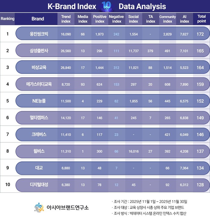 한정근 아시아브랜드연구소 대표는 “이번 K-브랜드지수 교육 상장사 순위는 디지털 학습 수요의 확대 속에서 각 기업의 콘텐츠 전략과 플랫폼 경쟁력에 대한 실효성이 반영된 결과다. 웅진씽크빅의 1위 복귀와 삼성출판사의 2위 상승은 학습 경험의 다양화와 키즈 콘텐츠 시장 강화가 주요 요인으로 분석된다”고 설명했다.