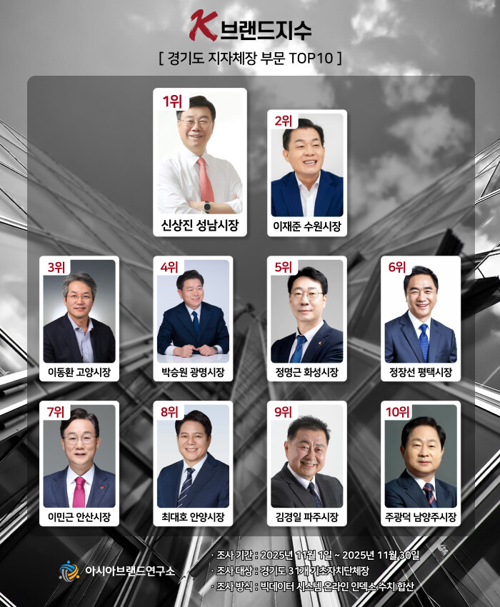 한정근 아시아브랜드연구소 대표는 “이번 K-브랜드지수 경기도 지자체장 부문에서 신상진 성남시장이 1위에 오른 것은 생활밀착형 정책이 빠르게 확산된 영향으로 해석된다. 이재준 수원시장과 박승원 광명시장의 상승 역시 도시 혁신 의제에 대한 관심 확대로 이어진 결과로 볼 수 있다, 경기도 지자체장의 브랜드 경쟁력은 단순한 도시 규모보다 ‘정책 전달력’과 ‘이미지 전환력’이 핵심 지표로 부각되는 상황”이라고 평가했다.