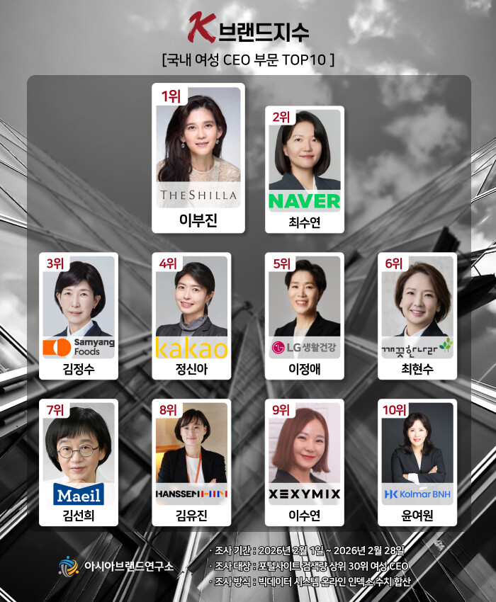 한정근 아시아브랜드연구소 대표는 “이번 K-브랜드지수 여성 CEO 부문은 글로벌 불확실성 속에서 업계를 선도하는 여성 리더들의 유연한 위기 대응 능력과 IT 혁신 산업의 강세가 순위에 직접적으로 반영된 결과로 분석된다. 1위를 굳건히 수성한 이부진 호텔신라 사장의 선두 장악은 안정적인 경영 성과와 대중적인 호감도를 바탕으로 한 흔들림 없는 오너 리더십을 빅데이터가 입증한 것"이라고 설명했다.