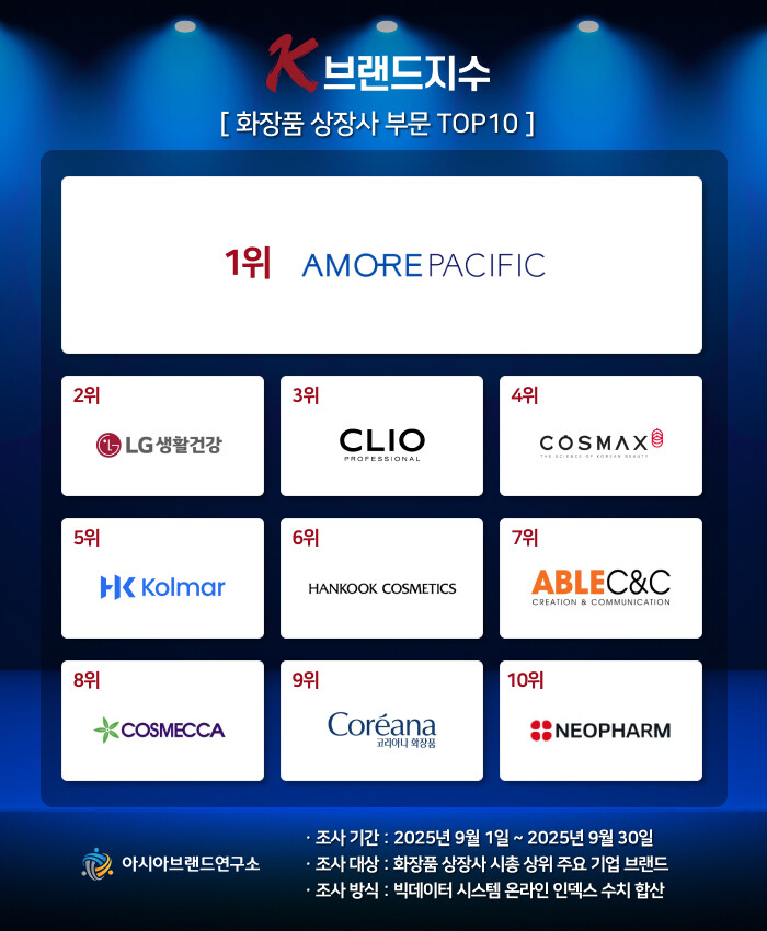K-브랜드지수 화장품 상장사 부문은 아모레퍼시픽이 1위를 수성했으며, LG생활건강(2위), 클리오(3위), 코스맥스(4위), 한국콜마(5위), 한국화장품(6위), 에이블씨엔씨(7위), 코스메카코리아(8위), 코리아나(9위), 네오팜(10위) 등이 TOP10에 이름을 올렸다.