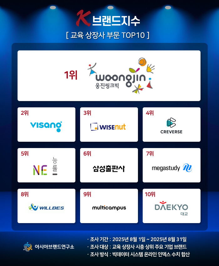 K-브랜드지수 교육 상장사 부문은 웅진씽크빅이 1위를 탈환했으며, 비상교육(2위), 와이즈넛(3위), 크레버스(4위), NE능률(5위), 삼성출판사(6위), 메가스터디교육(7위), 윌비스(8위), 멀티캠퍼스(9위), 대교(10위)가 TOP10에 이름을 올렸다.