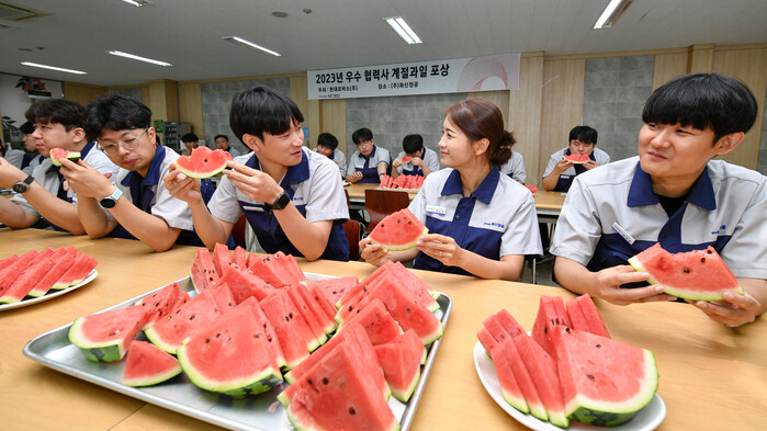 ▲ 경상북도 경산시 소재 화신정공 임직원들이 현대모비스가 전달한 계절과일을 나눠 먹으며 담소를 나누고 있다. [사진=현대모비스] |