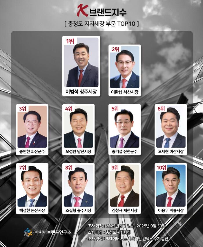 한정근 아시아브랜드연구소 대표는 “이범석 청주시장이 1위를 지켜낸 이번 K-브랜드지수 충청도 지자체장 부문은 순위 변동이 두드러지며 주목받고 있다. 기존 강세 지역과 더불어 신흥 도시와 군 단위가 상위권에 이름을 올리며 리더십 지형이 달라지고 있음을 보여준다”고 설명했다.