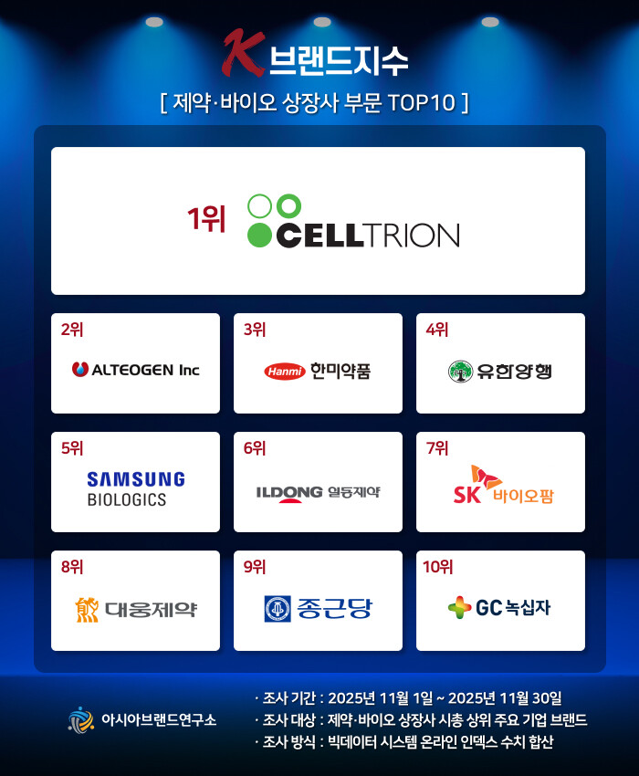 한정근 아시아브랜드연구소 대표는 “이번 K-브랜드지수 제약·바이오 상장사 부문에서 셀트리온이 1위를 지킨 것은 브랜드 신뢰도 회복의 흐름이 크게 작용한 것으로 볼 수 있다. 한미약품은 신약 파이프라인 관련 기대감이 시장에 반영되며 3위로 상승했으며, 삼성바이오로직스은 기술 경쟁력과 별개로 최근 한 달간의 정보 노출 강도가 상대적으로 낮았던 점이 영향을 미치며 5위로 하락했다”고 설명했다.