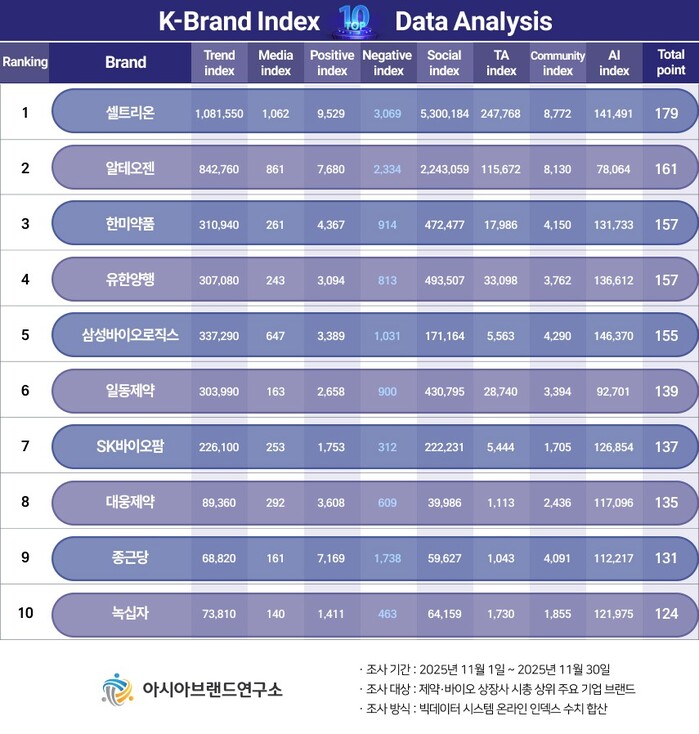 이번 K-브랜드지수 제약·바이오 상장사 부문은 제약·바이오 상장사 시총 상위 주요 기업 브랜드를 대상으로, 2025년 11월 1일부터 11월 30일까지의 온라인 빅데이터 1790만 5217건을 분석하여 진행됐다.