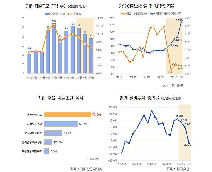 대출 등 외부자금 조달에 대한 기업들의 수요가 줄어드는 이유에 대해 상의는 적극적으로 투자에 나서기 어려운 경제상황을 지적했다. 지난해 민간 설비투자증가율이 점차 감소해 3분기 역성장(-6.5%)을 기록했고, 시설자금 대출증가율도 감소세를 보였다. 대내외 불확실성이 여전한 상황에서 고금리에 따른 자금조달비용 증가까지 더해지며 기업들은 신규 투자 및 사업 확장을 위해 무리하게 자금을 조달하기보다 내부 유보금으로 충당하거나, 사업운영에 필요한 운전자금에 대한 조달을 우선시 하는 것으로 풀이된다.