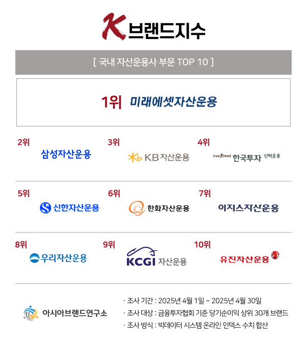 이번 K-브랜드지수 자산운용사 부문은 금융투자협회 기준 당기순이익 상위 30개 브랜드를 대상으로, 2025년 4월 1일부터 4월 30일까지의 온라인 빅데이터 1897만 5972건을 분석했다.