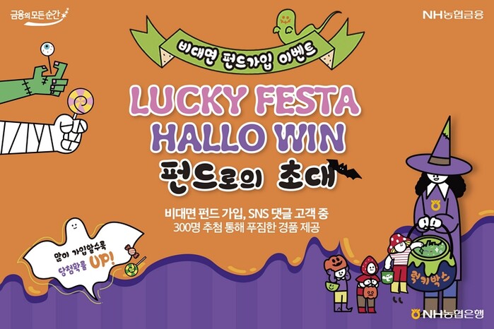 NH농협은행(은행장 권준학)은 지난 17일부터 11월 30일까지 비대면 펀드 신규 가입 고객과 SNS 게시물 댓글고객을 대상으로 푸짐한 경품을 추첨 제공하는‘럭키페스타할로윈(LUCKY FESTA HALLO WIN)’이벤트를 실시한다고 19일 밝혔다.