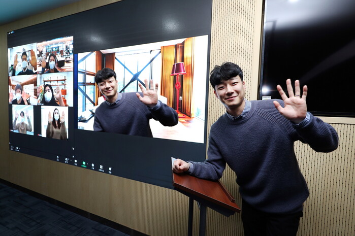 ▲ 대우건설 직원이 줌 배경화면으로 푸르지오 인테리어 장면을 활용하고 있다. [사진=대우건설 제공] |