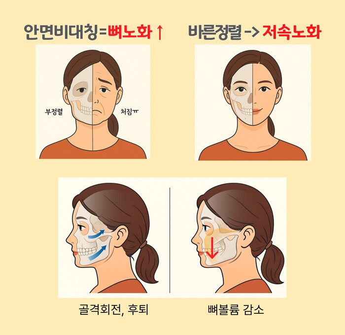 얼굴 뼈는 바른 정렬이 유지되어야 하중 분산, 근육의 균형 있는 사용, 관절의 안정성을 갖는다. 문제는 이 바른 정렬이 깨진 상태인 안면비대칭이 뼈 노화를 가속시킬 수 있다는 점이다.