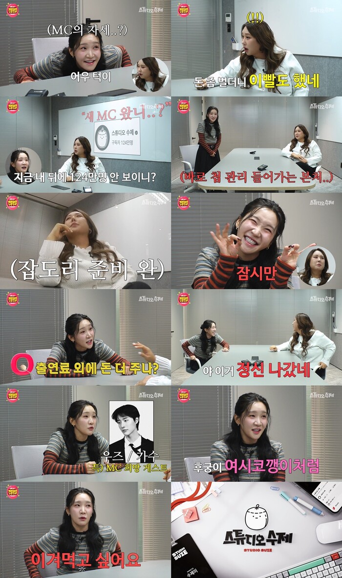 하지만 김지유는 풍자에게도 지지 않는 패기 넘치는 입담으로 앞으로의 활약을 기대하게 만든다. 첫 만남부터 지각해버린 김지유는 풍자가 “정신차려라. 늦은 이유가 뭐냐?”라며 꾸짖자 “숍에서 풍자 언니보다 좀만 더 예쁘게 해달라고 하다가…”라고 능청스레 응수해 압도적 티키타카를 선보인다. 이어 “글러먹었다. 앞으로 게스트를 이겨먹을 거냐?”라는 풍자의 물음에, 김지유는 냉큼 “이겨먹고 싶다”고 받아쳐 현장을 초토화시킨다. 풍자가 “단독 MC로 저자세를 지켜야 한다”는 말에 김지유는 턱을 책상에 붙이는 몸개그를 선보이는가 하면, “내 뒤에 (‘스튜디오 수제’ 유튜브 채널의) 구독자 125만 명이 안 보이냐?”는 풍자의 말에는 다급히 자리에서 일어나 “안녕하십니까!”라며 보이지 않는 구독자들에게 90도 인사하며 새 MC로 기강 잡힌 모습을 보여준다.