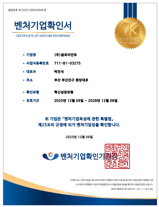 벤처기업 인증은 우수한 기술력과 혁신성, 성장 잠재력을 보유한 중소기업을 정부가 공식적으로 확인하고 지원하는 제도다. 글로비언트는 기술개발 현황 및 기업부설연구소 운영 내역, 재무평가, 특허 출원 및 국내외 수출 이력을 바탕으로 이번 인증을 획득했다.