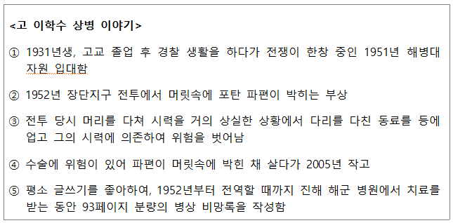 첫 번째 공연은 장단지구 전투에서 포탄 파편이 머리에 박히는 부상을 당했으나 이를 빼내지 못한 채 2005년 작고하신 6‧25참전유공자 고 이학수 상병의 이야기를 영상으로 소개한 후, 고인이 1952년부터 전역할 때까지 해군 병원에서 치료를 받는 동안 작성한 93페이지 분량의 ‘병상 비망록’ 중 일부를 발췌‧각색해 낭독한다.