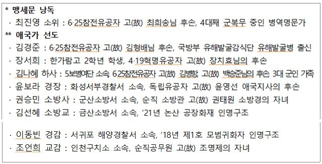 이날 국가유공자 증서수여는 1951년 입대해 6‧25전쟁에 참전, 육군 제3사단 소속으로 강원 금화지구 전투 중 전사한 고(故) 조종두님 등 총 5명에게 친수한다.