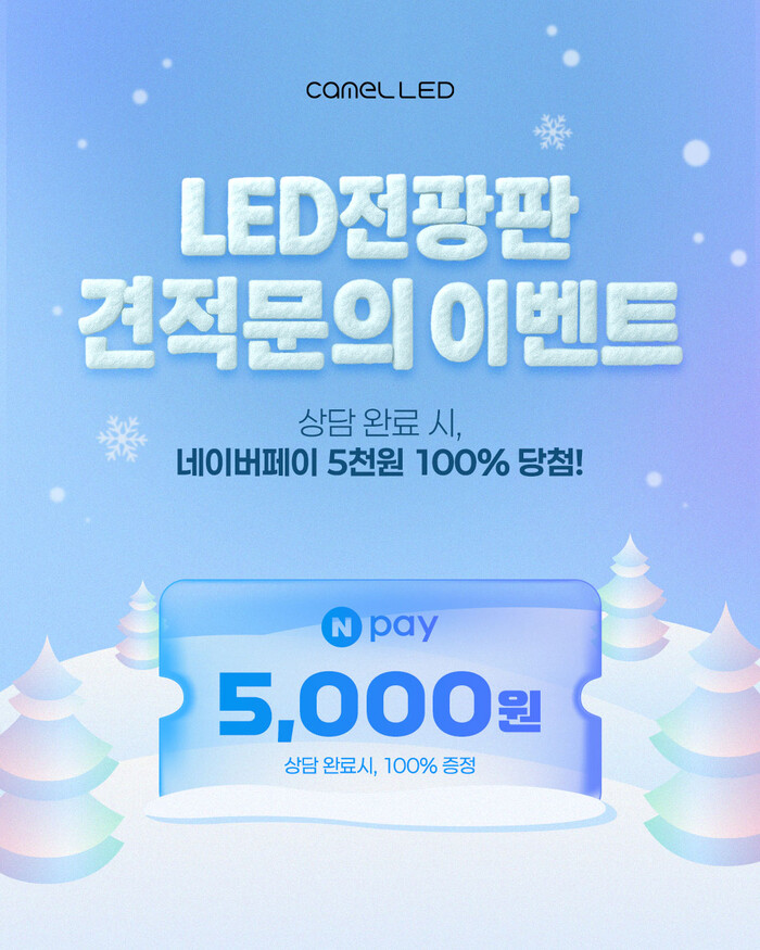 이번 이벤트는 이달 31일까지 한정으로 진행되며, 카멜 LED전광판 홈페이지를 통해 견적문의를 신청하고 상담을 완료하면 네이버페이 5000원권을 100% 증정한다. 경품은 내년 1월 5일에 발송될 예정이며, 내부 사정에 따라 조기 마감될 수 있다.