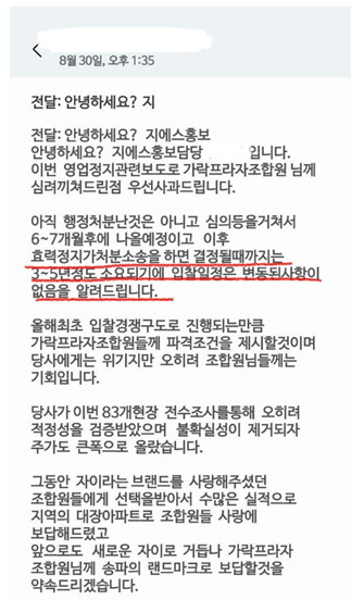 ▲ GS건설 담당자 측에서 보낸 것으로 보이는 송파구 가락프라자 조합원들 대상으로 한 문자. [이미지=조합원] |