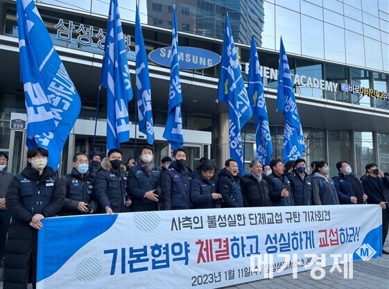전국금속노동조합연맹 삼성생명서비스노동조합(노조)은 금속삼성연대와 노동쟁의조정신청사건과 관련해 파업을 선언하고 사측의 불성실한 교섭 태도를 규탄하는 기자회견을 11일 오후 삼성생명서비스 사옥앞에서 개최했다.