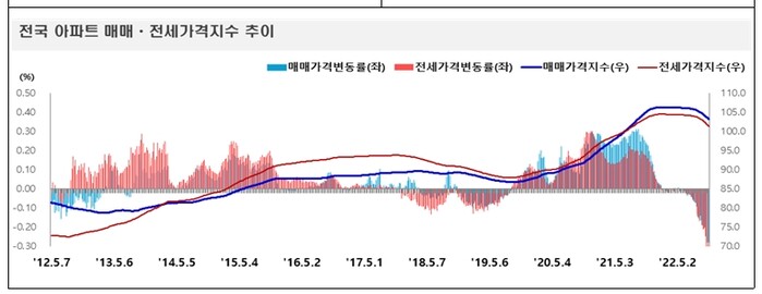 전국·수도권·지방 아파트 매매·전셋값과 서울 전셋값은 한국부동산원이 시세조사를 시작한 2012년 5월 이후 10년 5개월여 만에 사상 최대 낙폭을 기록했다.