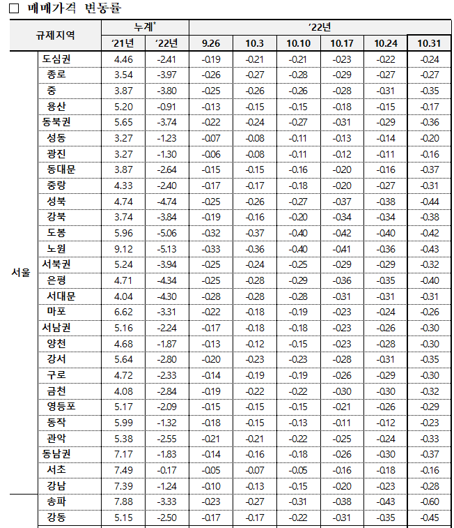 강동 –0.45%‧성북 –0.44%·노원 –0.43%·도봉 –0.42%·은평 -0.40%