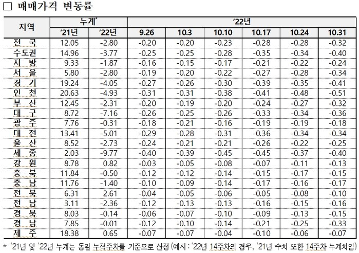 부동산원은 “가격하락 우려에 따른 매수심리 위축과 추가 금리인상 예정에 따라 매수문의가 극소한 상황이 계속되고 있다”며 “이런 가운데 현재 급매물에서 추가적인 가격하향이 조정돼도 거래성립 여부가 불투명한 상황이 지속되며 하락폭이 확대됐다”고 분석했다.