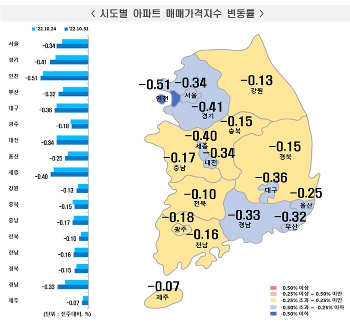경기(-0.35%→-0.41%)와 인천(-0.48%→-0.51%)도 일주일 전보다 낙폭을 더 키우며 가파른 하락세를 이어갔다.