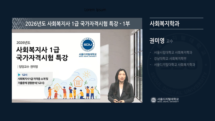 [메가경제=이상원 기자] 사이버대학 서울디지털대학교는 사회복지학과가 '2026년 사회복지사 1급 국가시험 대비를 위한 온라인 특강’을 공개했다고 26일 밝혔다.