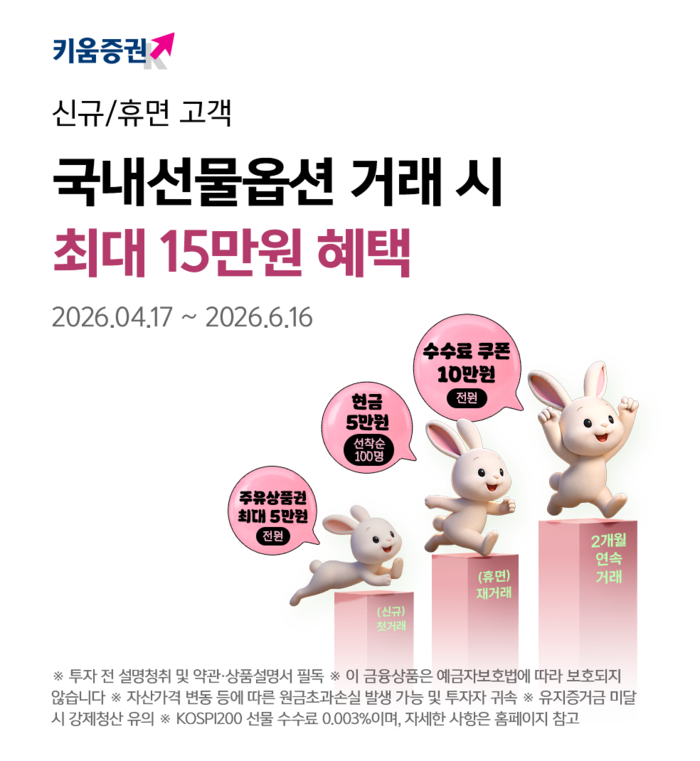 대상은 키움증권에서 국내선물옵션을 처음 거래하는 신규 고객과 최근 3개월간 거래가 없던 휴면 고객이며, 다음달 16일까지 신청할 수 있다.