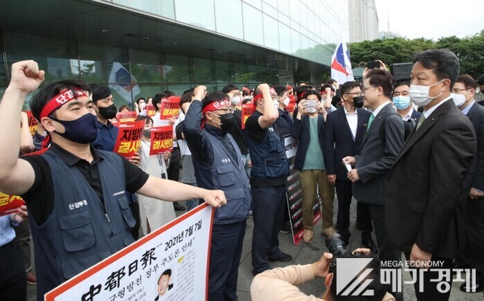 ▲한국산업은행 직원들이 본점에서 지방이전 저지를 촉구하는 시위를 하고 있다. [사진=금융노조] |