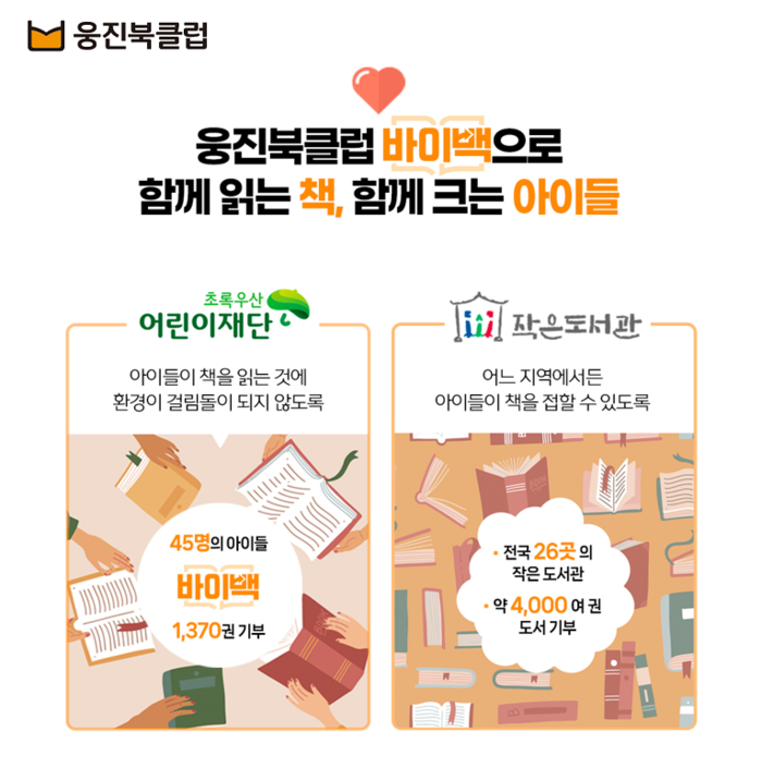 한편 웅진씽크빅은 지난해부터 소비자가 구매·이용한 전집을 반환하면 현금처럼 활용이 가능한 마일리지로 보상해주는 ‘웅진북클럽 바이백’ 서비스를 운영하며, 회수된 전집 중 선별된 도서를 지역사회에 기증하고 있다.