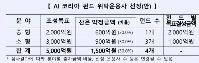 산업은행의 이번 출자사업은 지난 7월 4일자 정책금융지원협의회에서 논의된 AI 분야 집중지원 프로그램의 일환이다. 산은 출자 1500억원을 마중물로 중형(2000억원) 1개, 소형(1000억원) 3개 등 총 4개 5000억원 규모의 펀드가 조성될 예정이다.