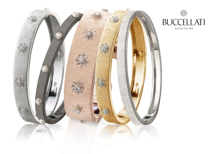 1919년에 창립된 부첼라티는 100년 역사를 자랑한다. 특별한 색의 흔하지 않은 원석을 사용하며 표면에 텍스처 느낌을 준 화이트 및 옐로우 골드로 조화를 이루는 것이 특징이다.