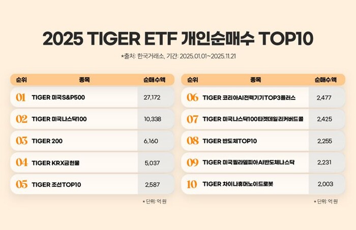 ‘2025년 TIGER 개인 순매수 톱10 ETF(2025년 1월 1일~11월 21일)’에는 글로벌 대표 지수부터 인공지능(AI), 반도체, 전력, 로봇 등 신성장 산업 및 금현물 테마까지 다양한 TIGER ETF 라인업이 포함됐다. 1위는 ‘TIGER 미국S&P500 ETF’가 차지했다. 해당 ETF의 11월 21일 기준 올해 개인 누적 순매수는 2조7172억원으로, 지난해에 이어 국내 개인 투자자가 가장 많이 선택한 ETF에 올라있다.