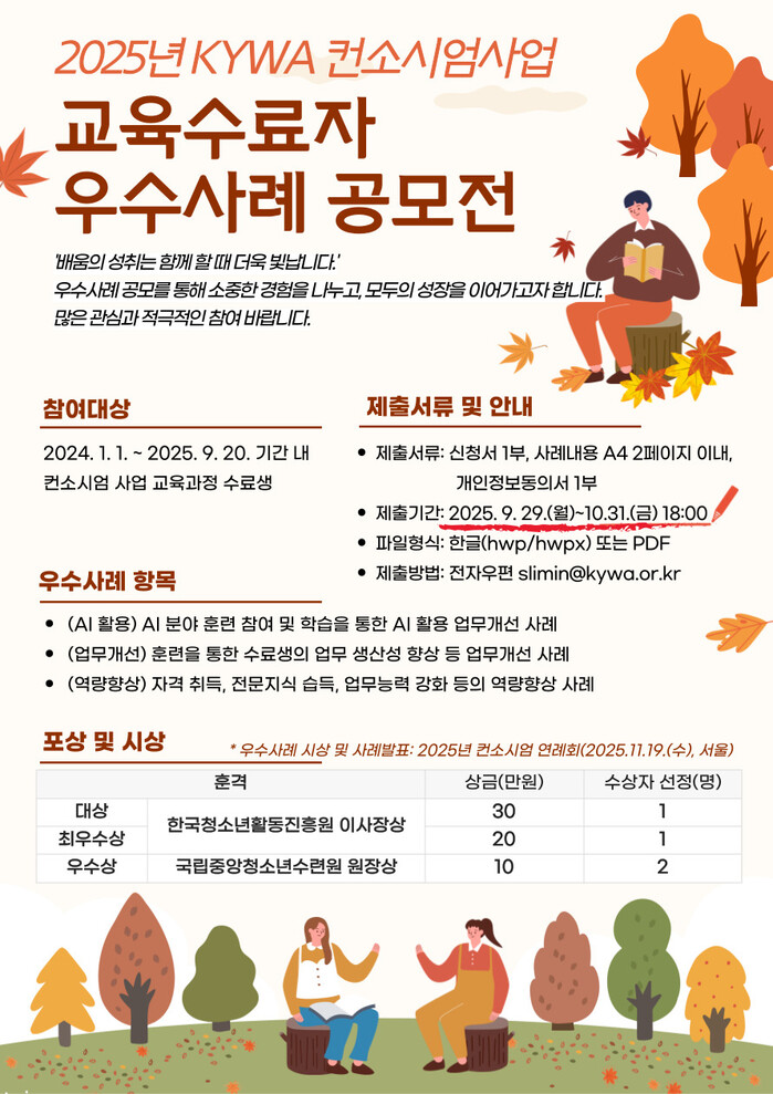 이번 공모전은 2024년 1월 1일부터 2025년 9월 20일까지 컨소시엄사업 교육과정을 수료한 교육생을 대상으로 하며, 주제는 ▲인공지능(AI) 분야 활용 ▲업무개선 ▲역량향상 중 하나를 선택해 산문 형식으로 사례를 작성하면 된다. 형식 제한은 없으며(A4 2페이지 이내, 수필·수기·기행문 등 가능), 성과 중심의 구체적인 사례 작성이 권장된다.
