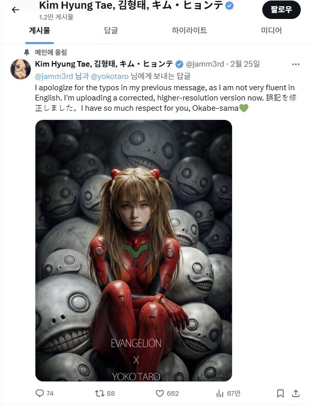 지난 25일 자신의 X(구 트위터)에 "에반게리온 신작을 요코 타로 씨가 맡게 됐다는 소식에 진심으로 축하하고 싶지만, 한편으로는 압박감을 느끼고 계실 듯해 가벼운 이미지로 대신하겠다"고 언급하며 에반게리온의 주인공 중에 한 명인 '아스카'를 소재로 한 일러스트를 게시했다.